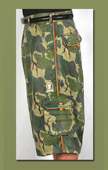 Our new triple-stitched army camo shorts are made from 100% cotton. They have rasta colored piping and are cut just below the knee and include 2 deep side pockets. Sizes available include 30 through 44